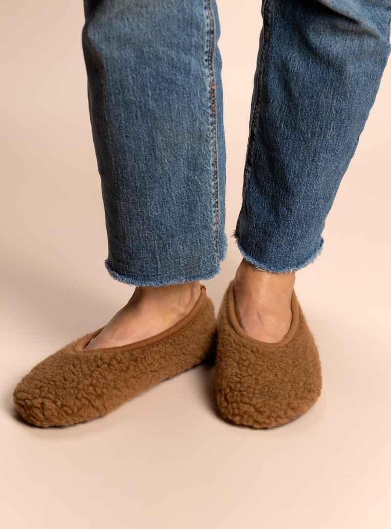 A simple cut combined with caramel trim creates a minimalist yet cozy effect. A thick layer of natural wool lifts the foot and protects it from the cold ground. Importantly, these slippers stay securely on the foot, and their shape provides exceptional comfort while walking.