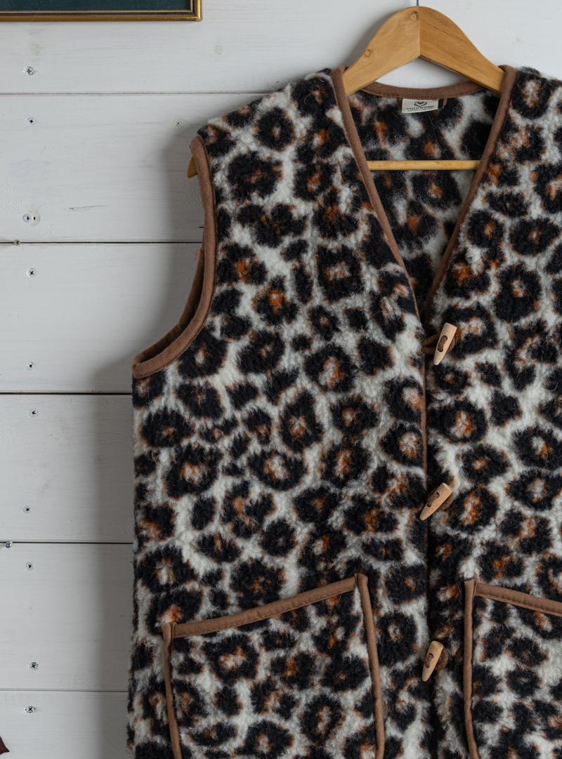 Unique women’s wool vest – leopard print with brown trim that adds character