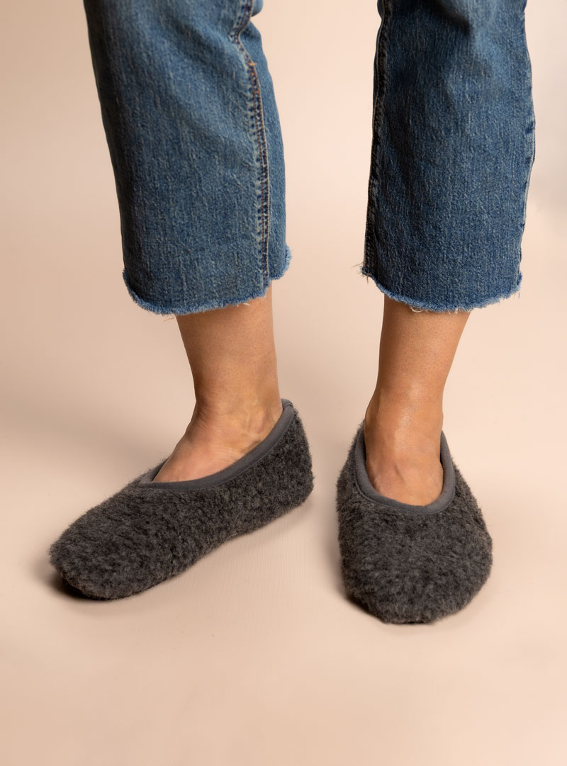 Vesna graphite wool slippers gently hug the foot, offering comfort, stability and a cosy embrace all day long.