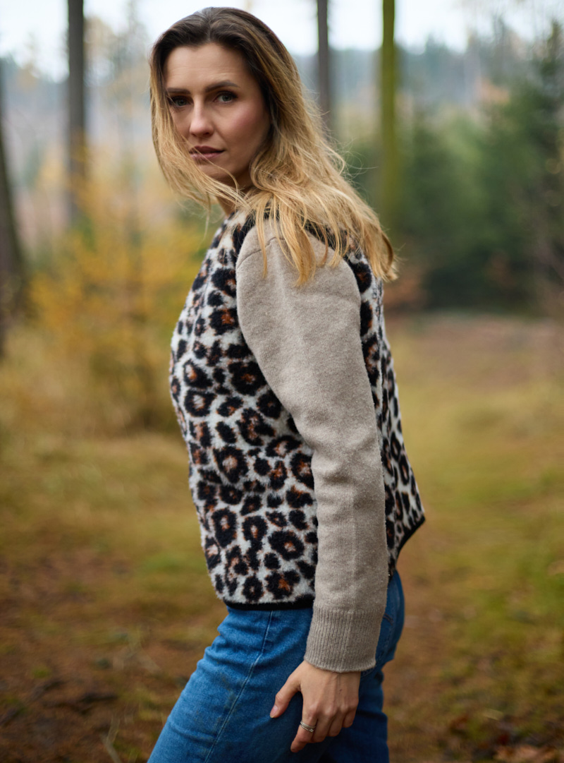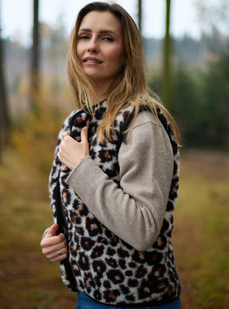• Wyrazisty design: wzór panterki nadaje charakteru i sprawia, że kamizelka wyróżnia się w codziennych stylizacjach.