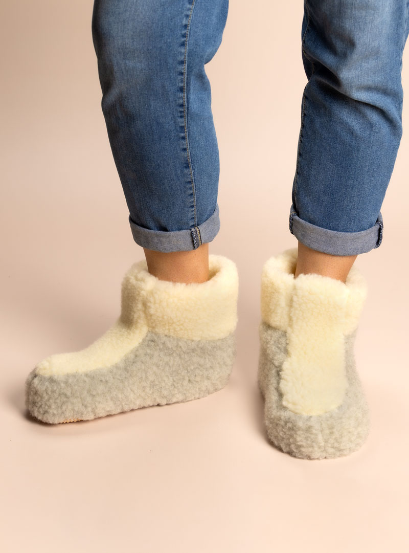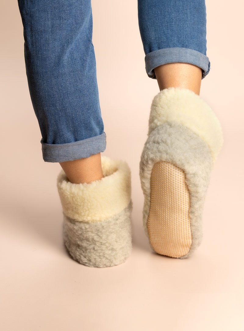 Podłoga może być chłodna, ale Twoje stopy nie muszą tego odczuwać.  Kapcie wełniane długie dwukolorowe ecru + jasny szary łączą komfort, naturalne ciepło i miękkość, tworząc idealną ochronę dla Twoich stóp.