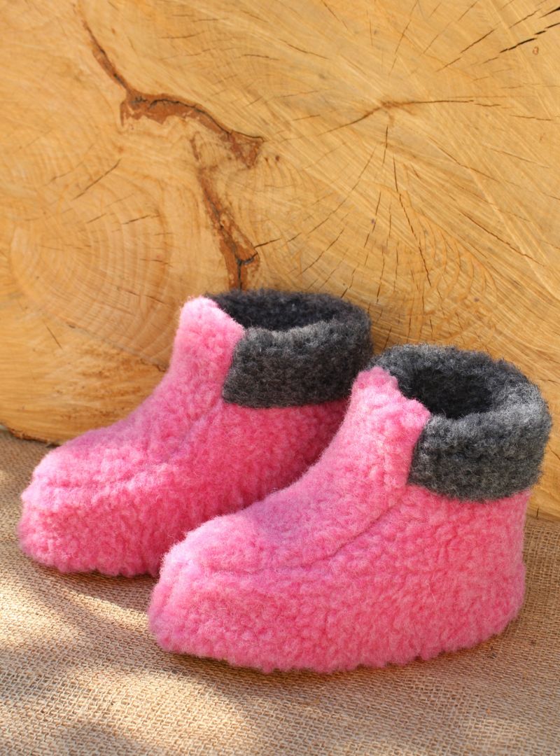 Kapcie wełniane dziecięce róż + grafit – ciepło, swoboda i naturalna troska od pierwszego kroku