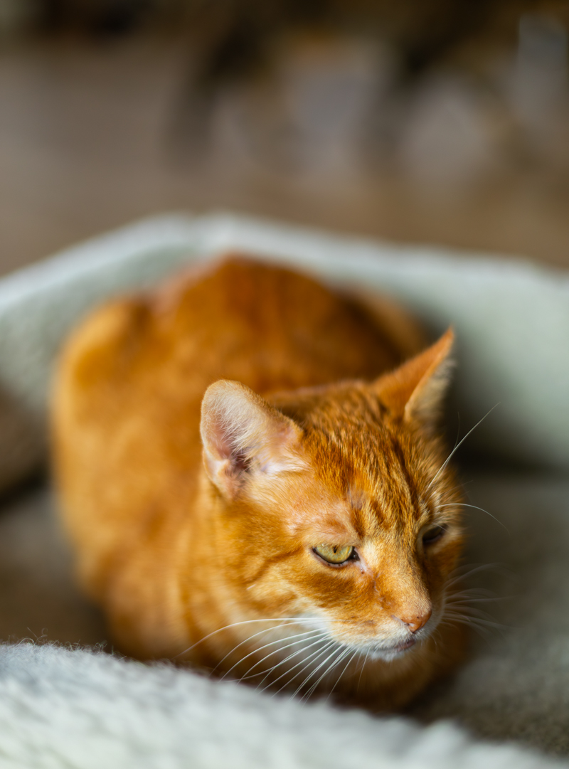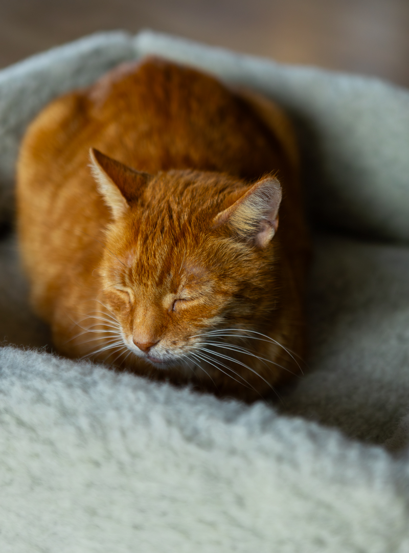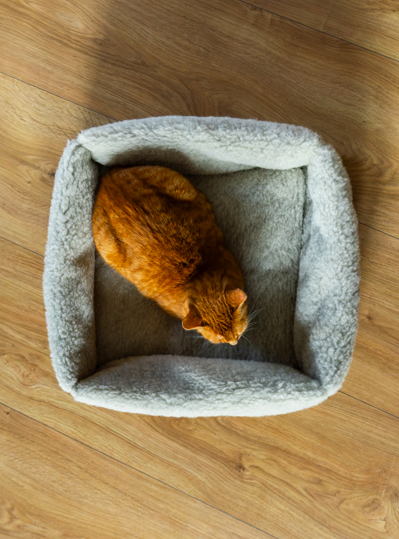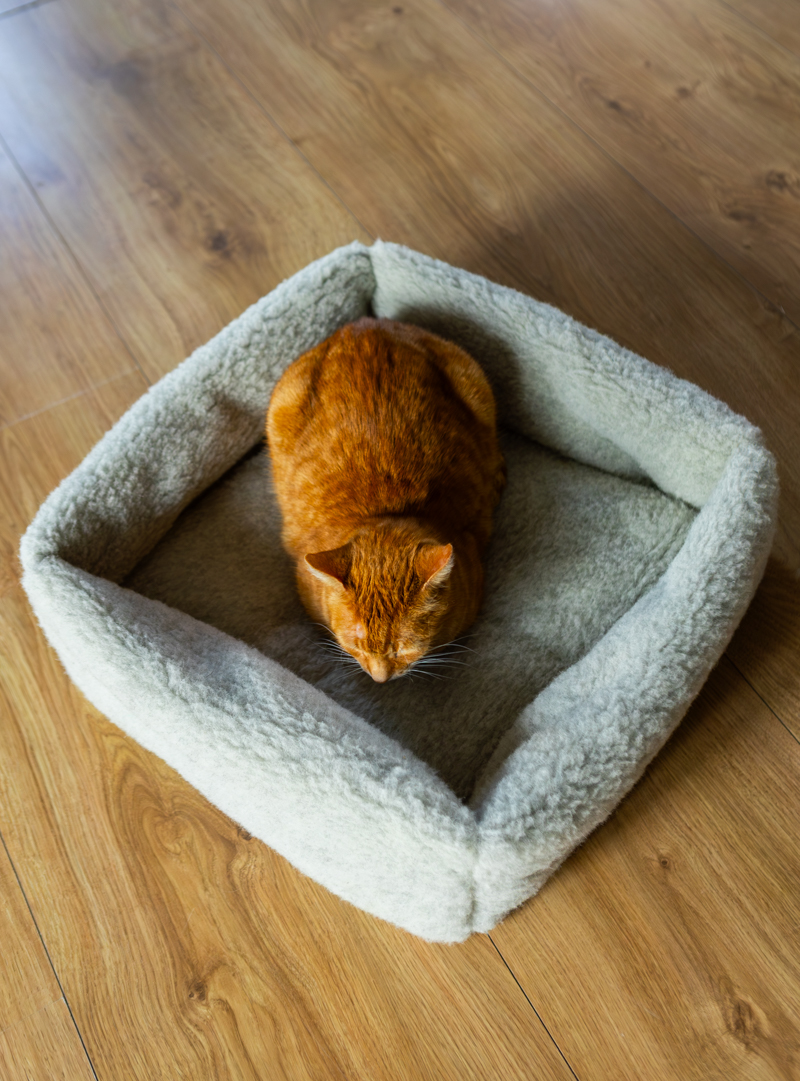Rudy kot leży w miękkim, białym legowisku na drewnianej podłodze