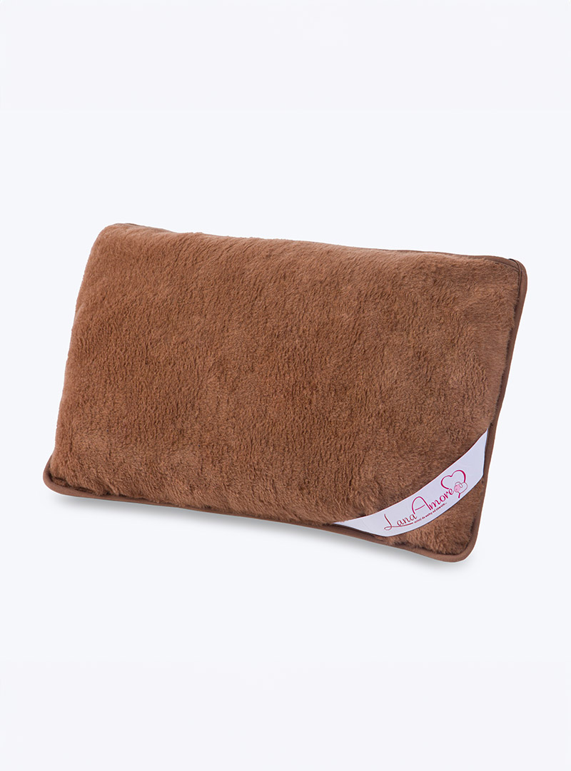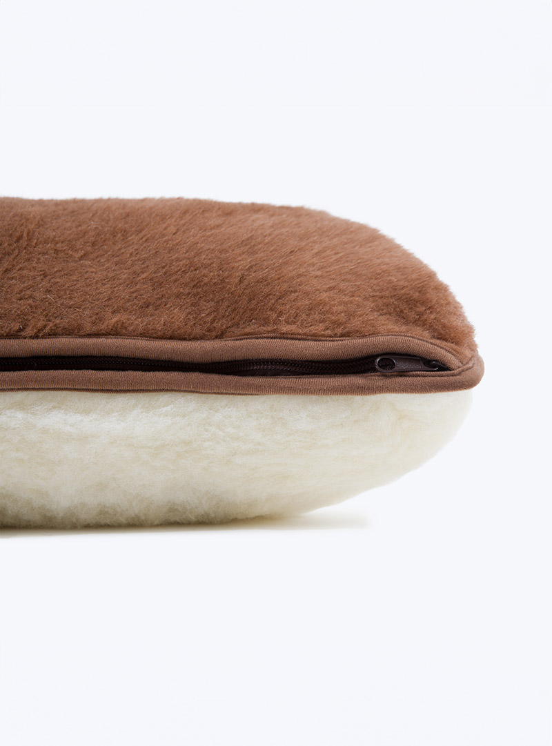 Poduszka wełniana Marino brązowa jest dwustronna. Jedna strona ma jednolity, elegancki odcień brązu. Druga strona jest w typowym dla wełny kolorze kremowym/ecru. Dodatkowo poduszka ma brzegi wykończone elegancką lamówką w kolorze brązowym.